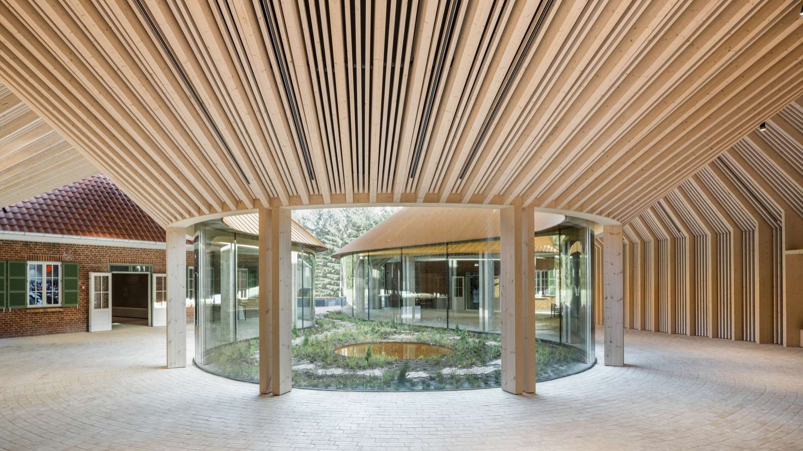 Van buitenaf ziet de verbindingsgang van cortenstaal eruit als een gesloten muur. Van binnen sluit deze met zijn houten planken, gewelfde plafond en 80.000 gele bakstenen harmonieus aan bij de twee bakstenen gebouwen die haaks op elkaar staan.