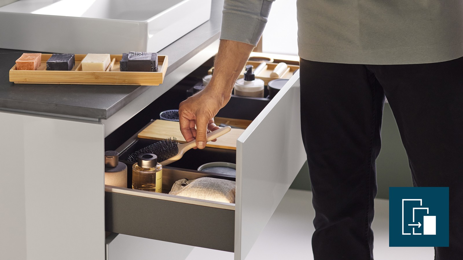 Le contenu compte aussi ! Les accessoires peuvent être rangés proprement dans des boîtes de rangement et des compartiments dans le tiroir. Pour les séries de salles de bains Geberit ONE, Geberit Acanto et Geberit iCon il existe un système d'organisation modulaire avec des compartiments de couleur bambou et lave. Les ensembles modulaires sont optimisés pour chaque largeur de tiroir et sont disponibles en option.